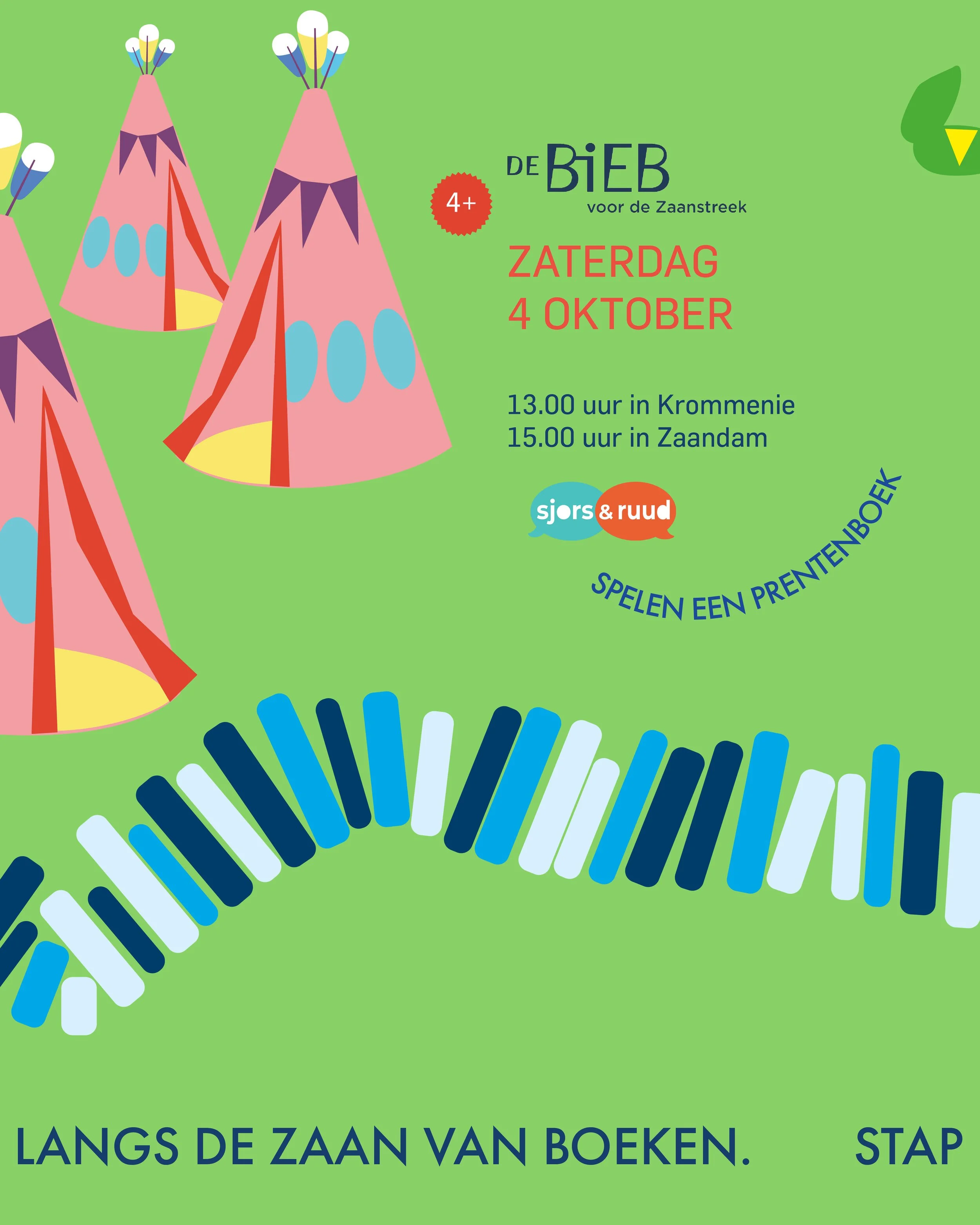 Met een knipoog naar mijn eerdere werk voor Zaanstad Leest – waar De Bieb ook aan meedeed – heb ik opnieuw de ‘Zaan in boeken’ gebruikt als visueel element. Ook nu vaar je langs de Zaan in boeken, en kan je onderweg ‘uitstappen’ bij de verschillende evenementen.